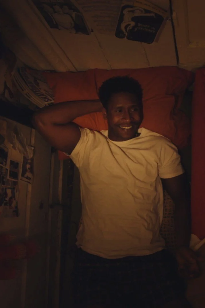 Model sits up on bed or edge of bed in a haze and quickly checks his head to see if his wave cap had falling off whist sleeping